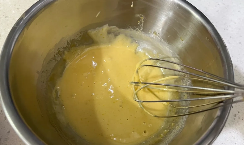 這裡有個常見誤區:很多人以為打越久越好,其實過度打發會讓蛋糊變粗糙,烤出來或冷藏後容易出水。我建議打發到 8 分鐘時就停下來檢查,用刮刀舀起看看狀態。