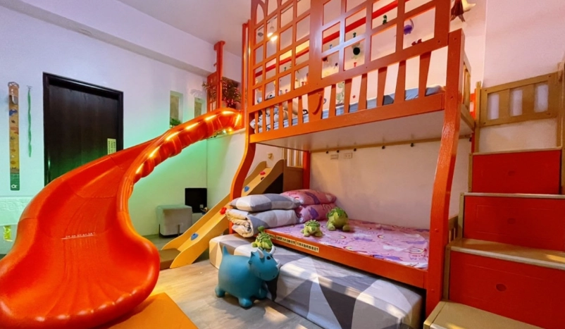 這間是「遊戲派」的首選。從二樓直接滑到一樓客廳的旋轉溜滑梯是最大賣點,還有迷你籃球架、小車車等。房間設計成賽車、公主等主題,孩子很買單。地點在北屯,離市區、太原夜市不遠,生活機能方便。需要注意是,因為遊戲區在客廳,如果孩子睡得早,大人想繼續在客廳活動可能會互相干擾。台中包棟民宿