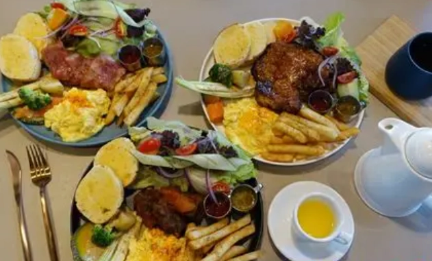 如果你喜歡西式早餐,後站也有幾家咖啡廳提供早午餐。有一家叫「漫時光」的店,環境舒適,適合慢慢吃。他們的套餐大概150元到200元,有沙拉、麵包和飲料。我吃過他們的班尼迪克蛋,蛋汁流出來的樣子很誘人,但麵包有點硬,個人覺得普通。