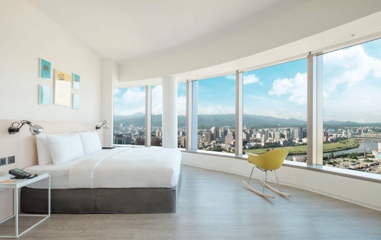 這家最大賣點是房間有整面落地窗,可以看到101。我特別喜歡他們的浴缸就放在窗邊,晚上邊泡澡邊看夜景真的很享受。但要注意,低樓層房間會被對面大樓看光光,記得選高樓層。