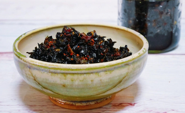 這道菜是我夏天的必備,清爽又簡單。做法是:小黃瓜切片後用鹽抓醃10分鐘,擠掉水分,然後加入泡軟的乾紫蘇葉、蒜末、一點糖和醋拌勻。乾紫蘇葉的香氣能中和黃瓜的青澀感,吃起來特別解膩。我個人喜歡加點辣椒,但如果你怕辣可以省略。