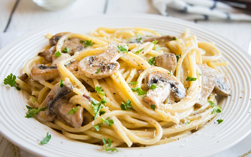 - 做法:先煮麵,同時用少量橄欖油炒香蒜末和蘑菇,加入牛奶煮濃稠,最後拌入麵條和起司。