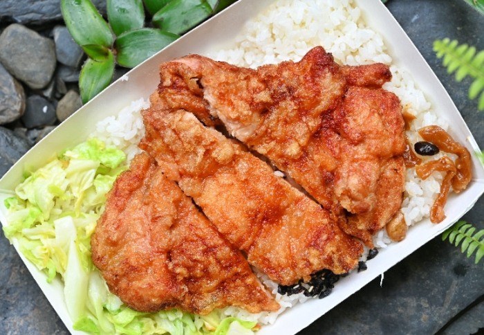 - 招牌排骨草袋飯:重點就是那塊炸排骨!使用特選里肌肉,薄薄裹粉炸至金黃酥脆,肉質厚實軟嫩不乾柴,醃漬風味獨特,鹹香夠味超級下飯。所謂「草袋飯」是指用藺草編織的容器盛飯,有淡淡草香(不過現在很多改用仿草容器了)。